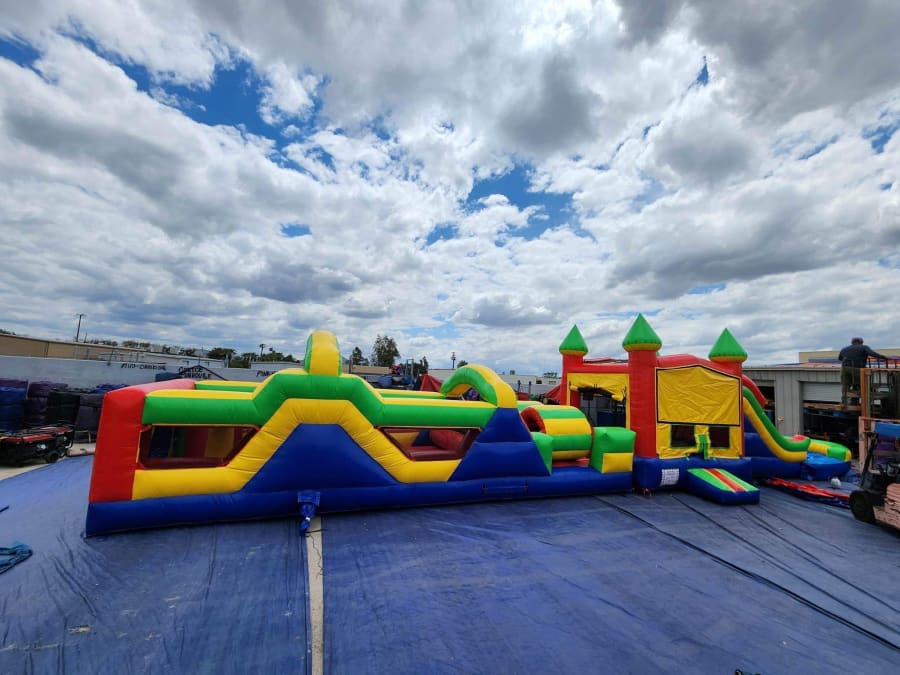 Our inflatable units are made from durable materials and undergo rigorous safety inspections to ensure a worry-free experience for all participants. You can rest easy knowing that your guests are in for a safe and thrilling adventure with our Rainbow 60ft Obstacle/Bounce House.