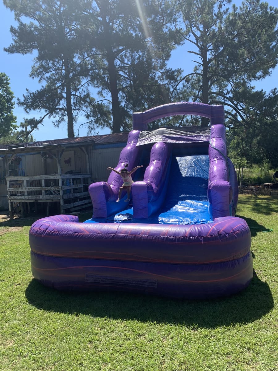 This Purple/Pink themed water slide is perfect for the summer. It is a single slide with a stair type entrance for your guest to climb easily to the top and slide down. One feature this slide includes is a water hose attached at the top that sprinkles down the slide to make it slippery fast.