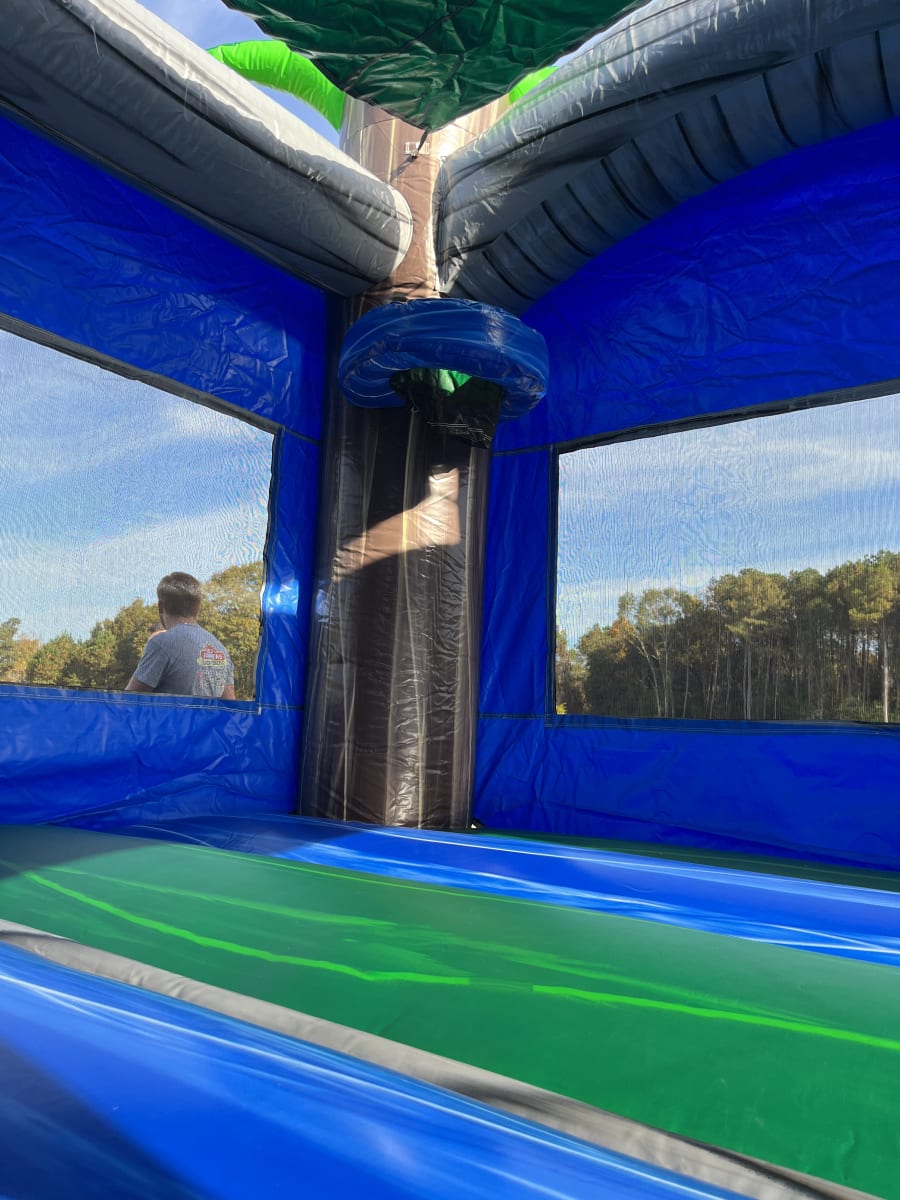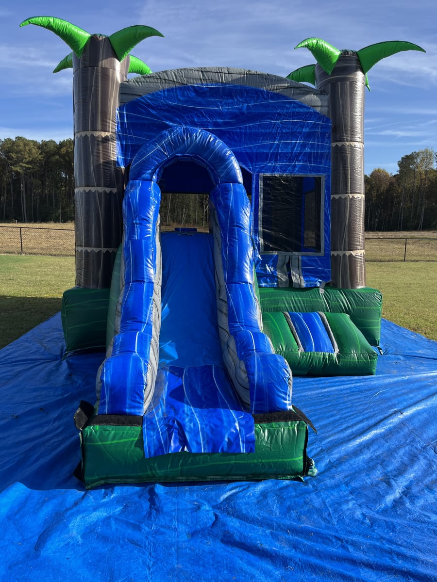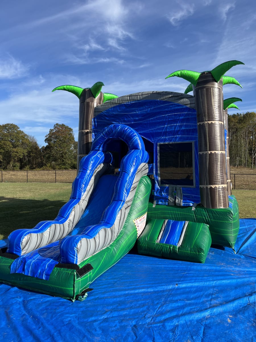 This Palm Tree Mini Combo is perfect for any season. It includes a basketball hoop inside the bounce house and a slide at the end .It is super fun for your guest and great for any party especially a tropical theme party .One feature this slide includes is a water hose attached at the top that sprinkles down the slide to make it slippery fast.