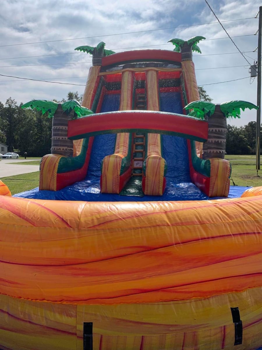 This is the 20 ft. fire water slide marble. This unique 20 foot waterslide is sure to wow all your guests. The orange and red marble make this water slide look hot. Climb to the top of the platform and slide down the 20 foot slide for a thrilling water slide experience. Be sure to book This water slide early. (ENTRANCE TO SETUP AREA MUST BE AT LEAST 4 FEET WIDE)