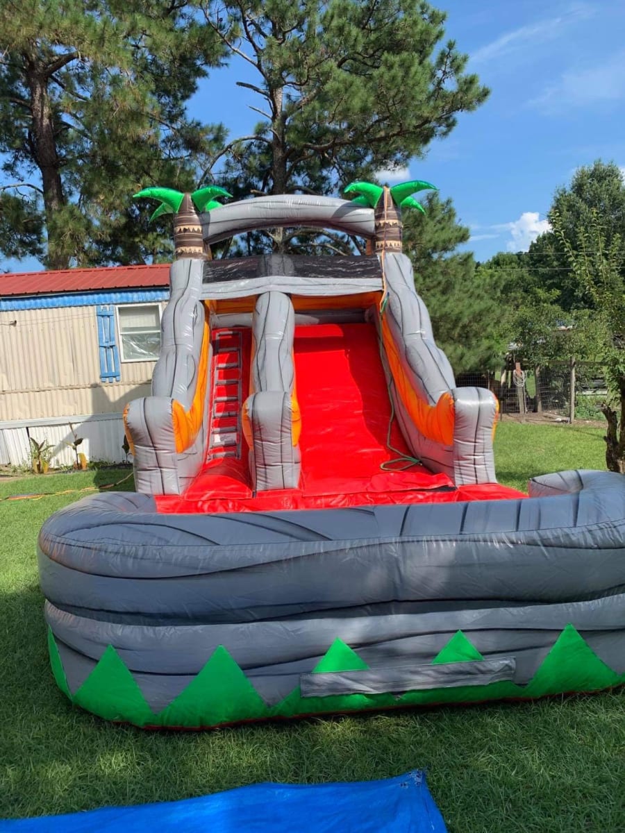 This Volcano themed water slide is perfect for the summer. It is a single slide with a stair type entrance for your guest to climb easily to the top and slide down. One feature this slide includes is a water hose attached at the top that sprinkles down the slide to make it slippery fast.