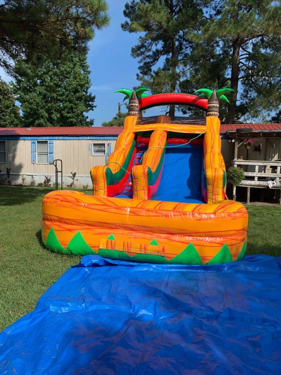 This Tropical/Maui themed water slide is perfect for the summer. It is a single slide with a stair type entrance for your guest to climb easily to the top and slide down. One feature this slide includes is a water hose attached at the top that sprinkles down the slide to make it slippery fast. We deliver to areas like Goldsboro, Kinston, Mount Olive, and Pink Hill. Free delivery for areas within a 40 minutes of travel.