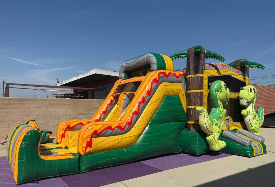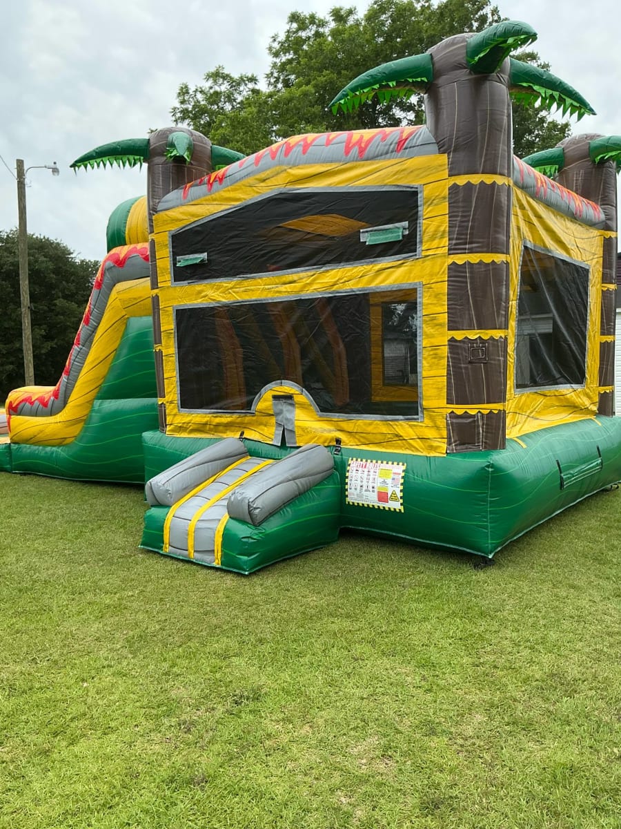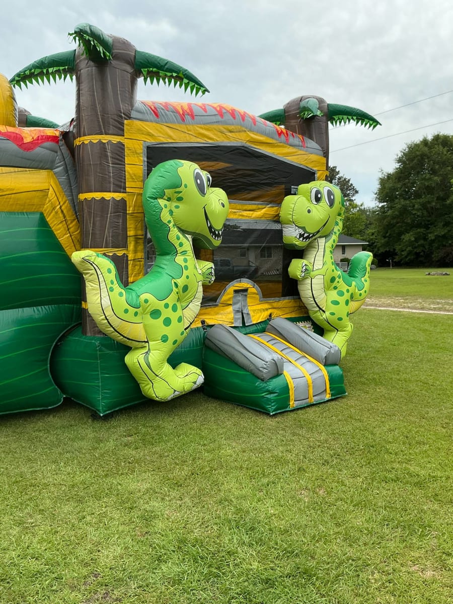 Make your next party or event unforgettable with our bounce house 4 in 1 DINOSAUR DRY in Goldsboro, Kinston, Mount Olive, and Pink Hill. This exciting Tropical 3-D Dinosaur Marble Bounce House/Slide is designed to delight children of all ages and transform your backyard into a prehistoric adventure! 🦖🌴