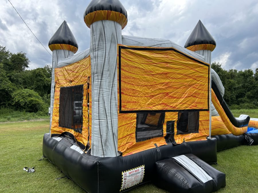 This Blue Marble 5 in 1 is perfect for any season. It includes a basketball hoop inside the bounce house and a slide at the end. One feature this slide includes is a water hose attached at the top that sprinkles down the slide to make it slippery fast.