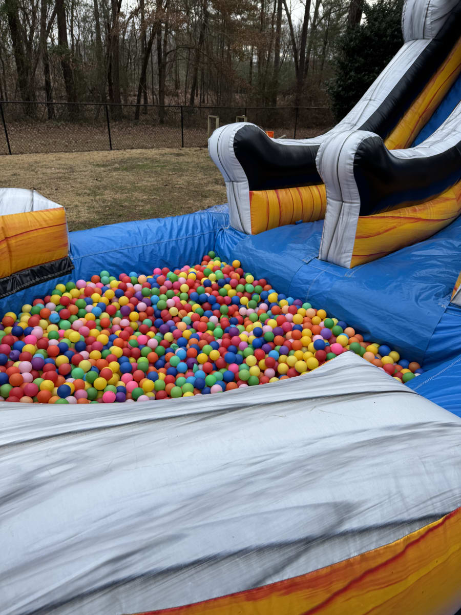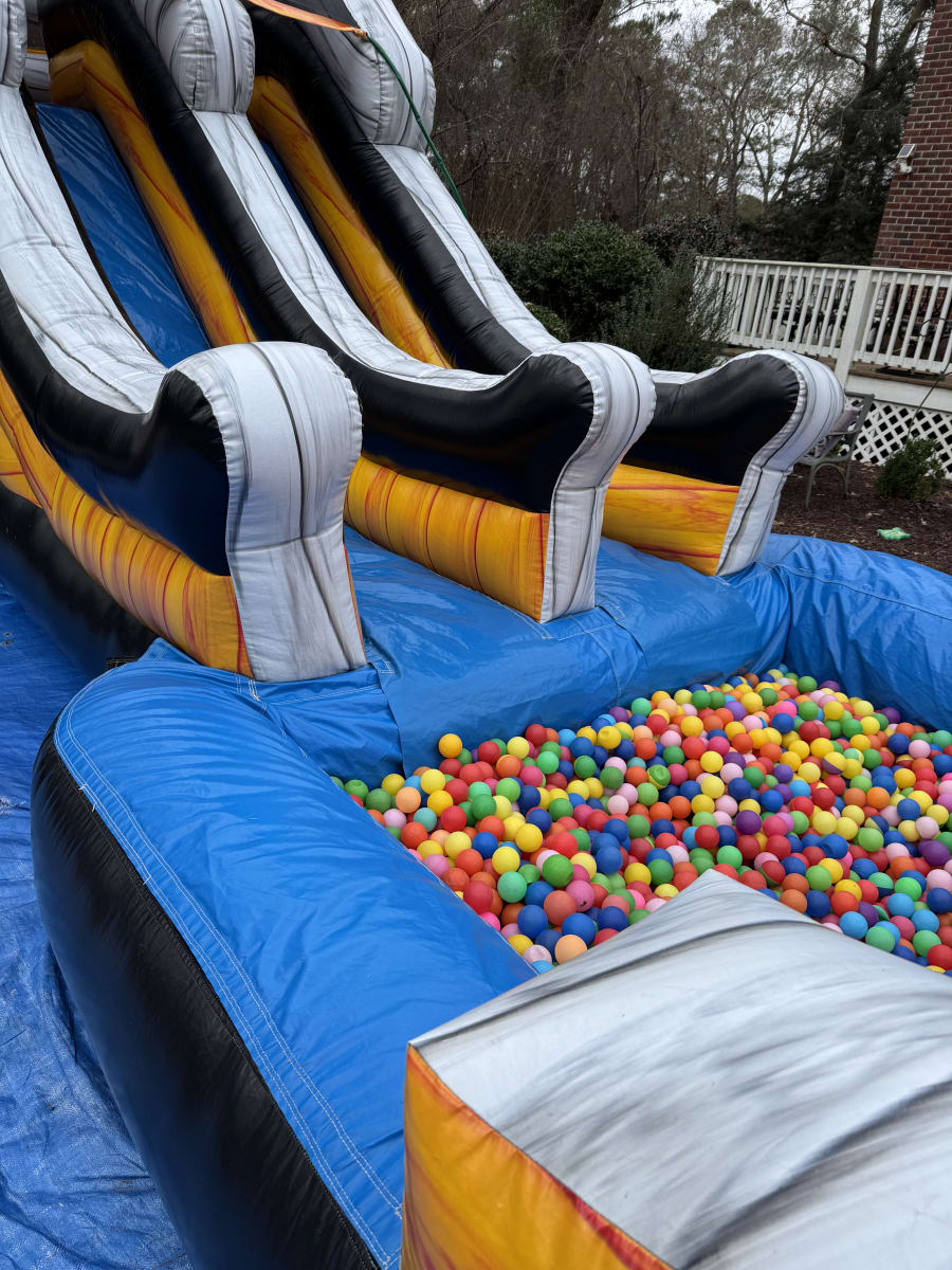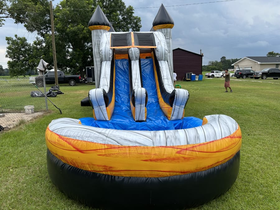 This Blue Marble 5 in 1 is perfect for any season. It includes a basketball hoop inside the bounce house and a slide at the end. One feature this slide includes is a water hose attached at the top that sprinkles down the slide to make it slippery fast.