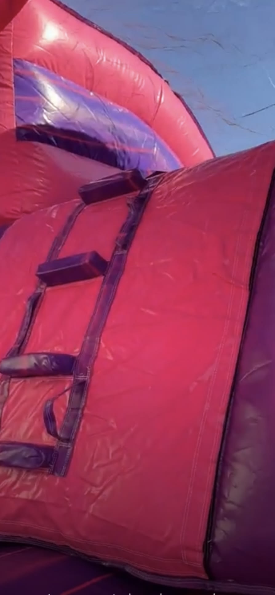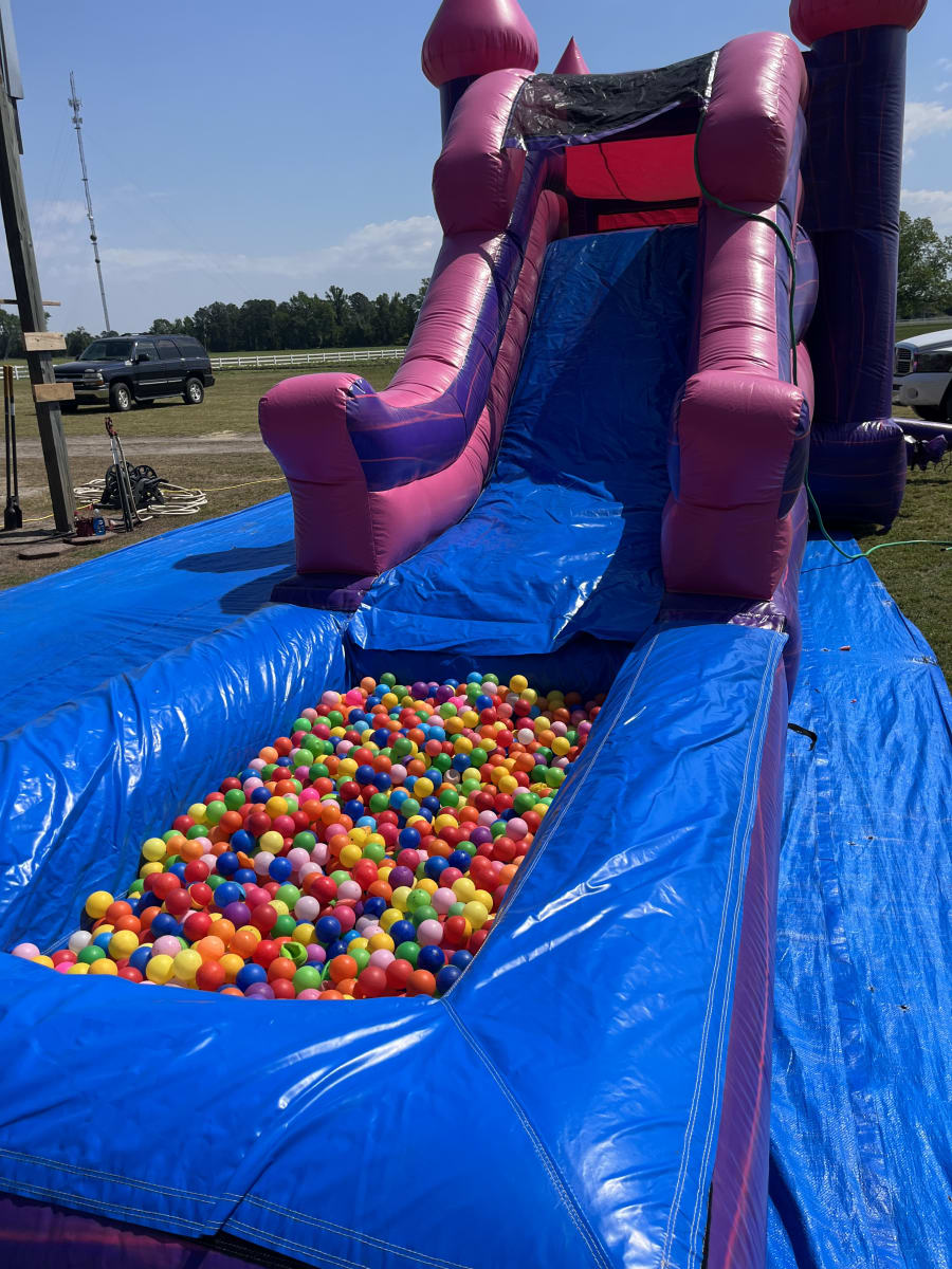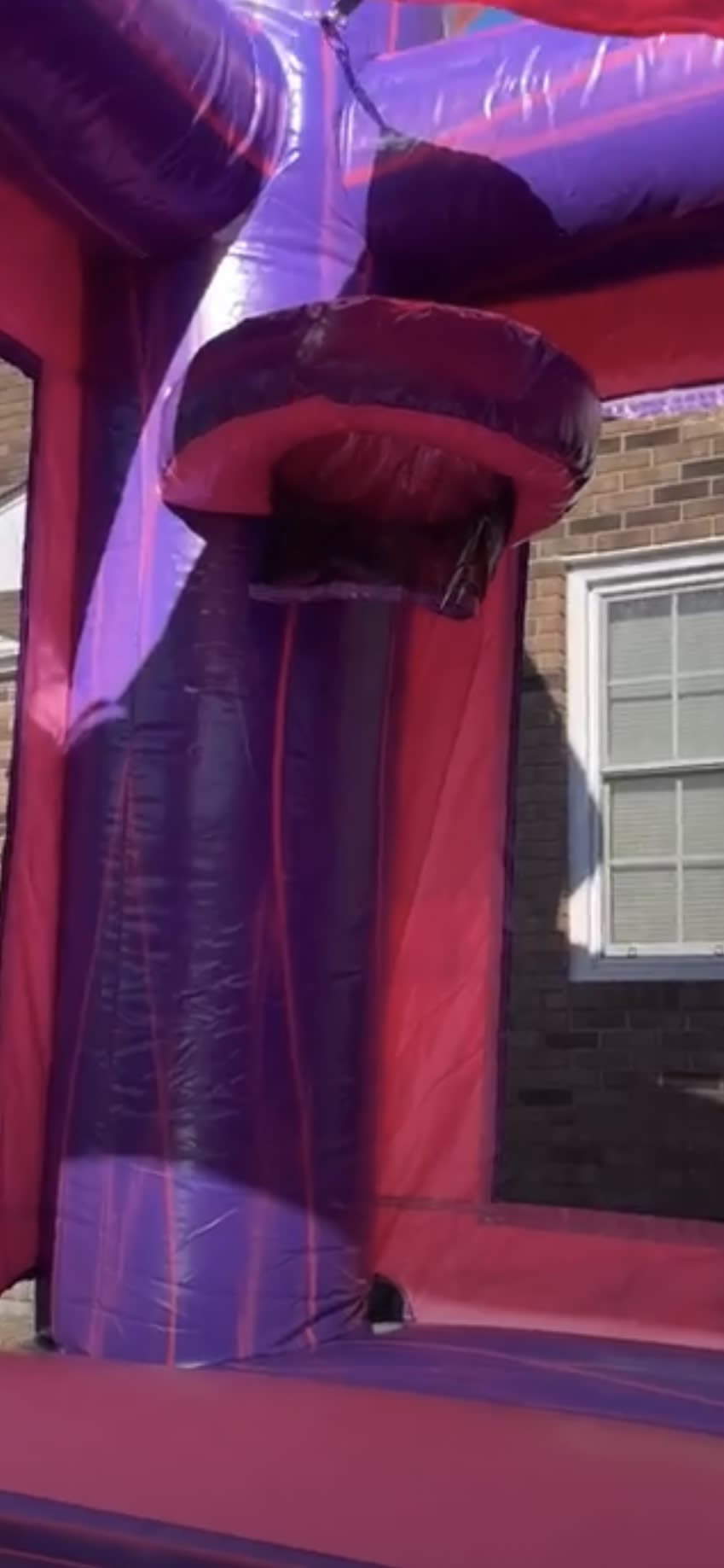 This pink marble House/slide is perfect for any season. It includes a basketball hoop inside the bounce house and a slide at the end. One feature this slide includes is a water hose attached at the top that sprinkles down the slide to make it slippery fast. We deliver to areas like Goldsboro, Kinston, Mount Olive, and Pink Hill. Free delivery for areas within a 40 minutes of travel.