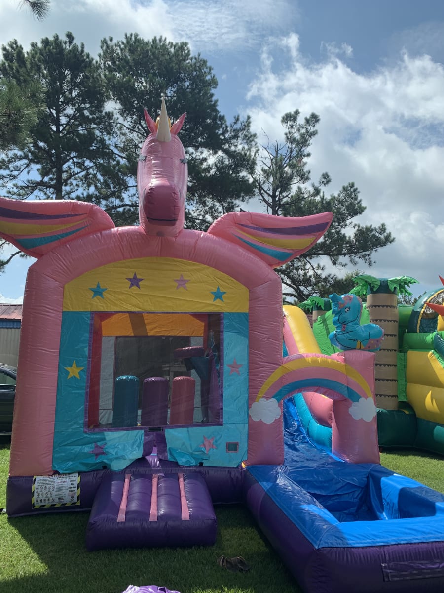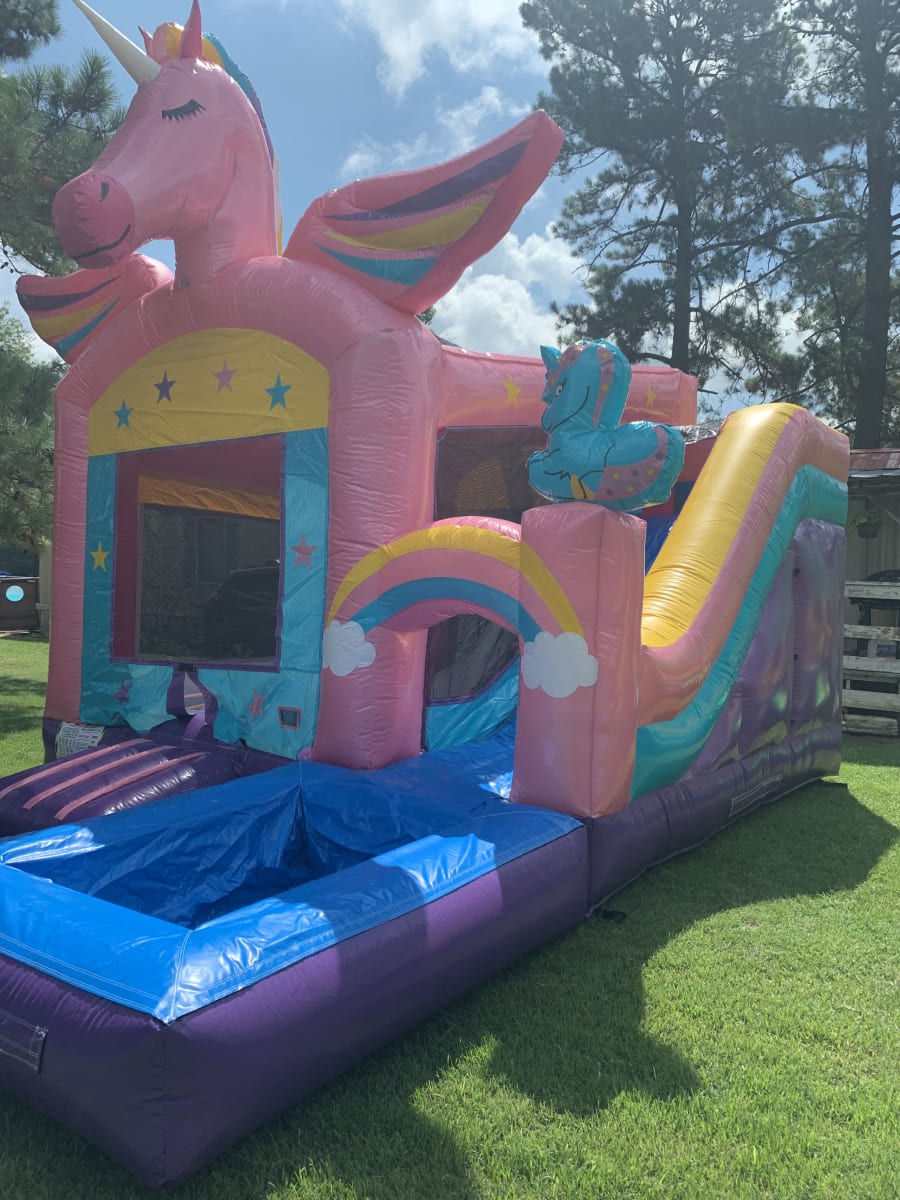 This Unicorn Bounce house is perfect for any season. It includes a basketball hoop inside the bounce house and a slide at the end. The bounce house has a obstacle course. One feature this slide includes is a water hose attached at the top that sprinkles down the slide to make it slippery fast. It also has a nice glitter and unicorn touch to it for a princess and unicorn theme. We deliver to areas like Goldsboro, Kinston, Mount Olive, and Pink Hill. Free delivery for areas within a 40 minutes of travel.