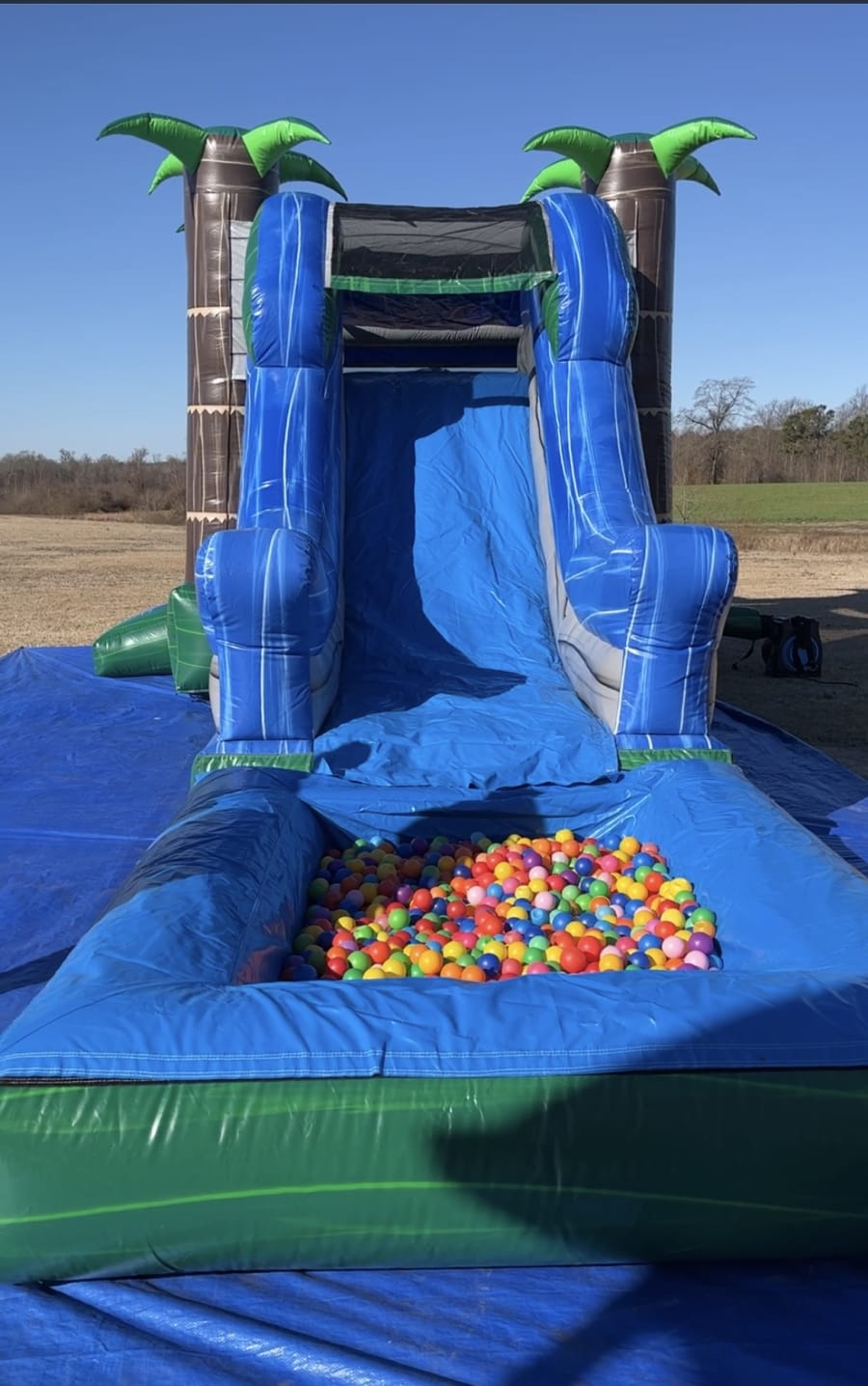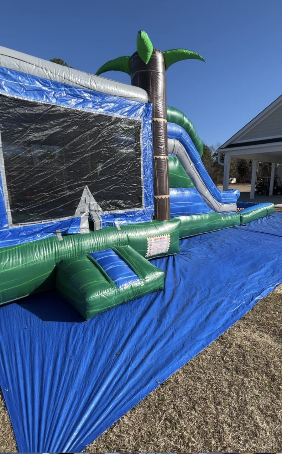 This Tropical Marble Bounce House/Slide is perfect for any season. It includes a basketball hoop inside the bounce house and a slide at the end. One feature this slide includes is a water hose attached at the top that sprinkles down the slide to make it slippery fast. We deliver to areas like Goldsboro, Kinston, Mount Olive, and Pink Hill. Free delivery for areas within a 40 minutes of travel.