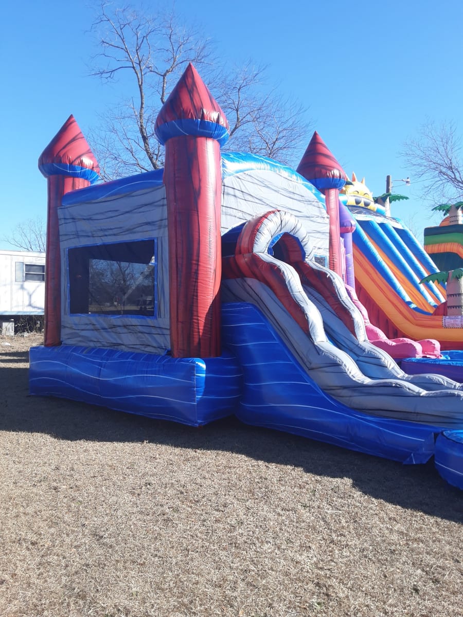 This Patriotic Mini Combo is perfect July 4th but its also amazing for any other season includes a basketball hoop inside the bounce house and a slide at the end .It is super fun for your guest and great for any party .One feature this slide includes is a water hose attached at the top that sprinkles down the slide to make it slippery fast.