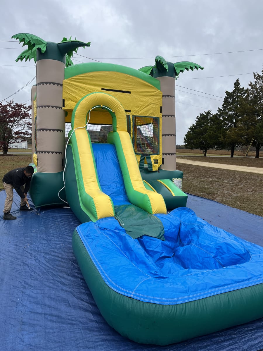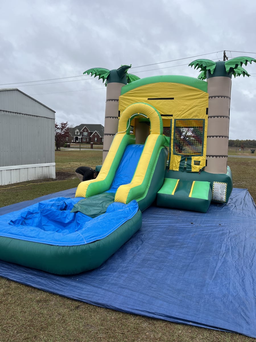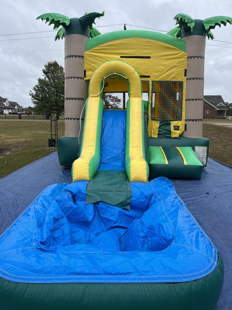 This Palm Tree Mini Combo is perfect for any season. It includes a basketball hoop inside the bounce house and a slide at the end .It is super fun for your guest and great for any party especially a tropical theme party .One feature this slide includes is a water hose attached at the top that sprinkles down the slide to make it slippery fast.