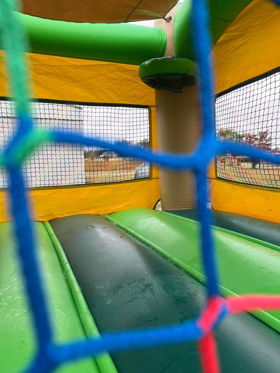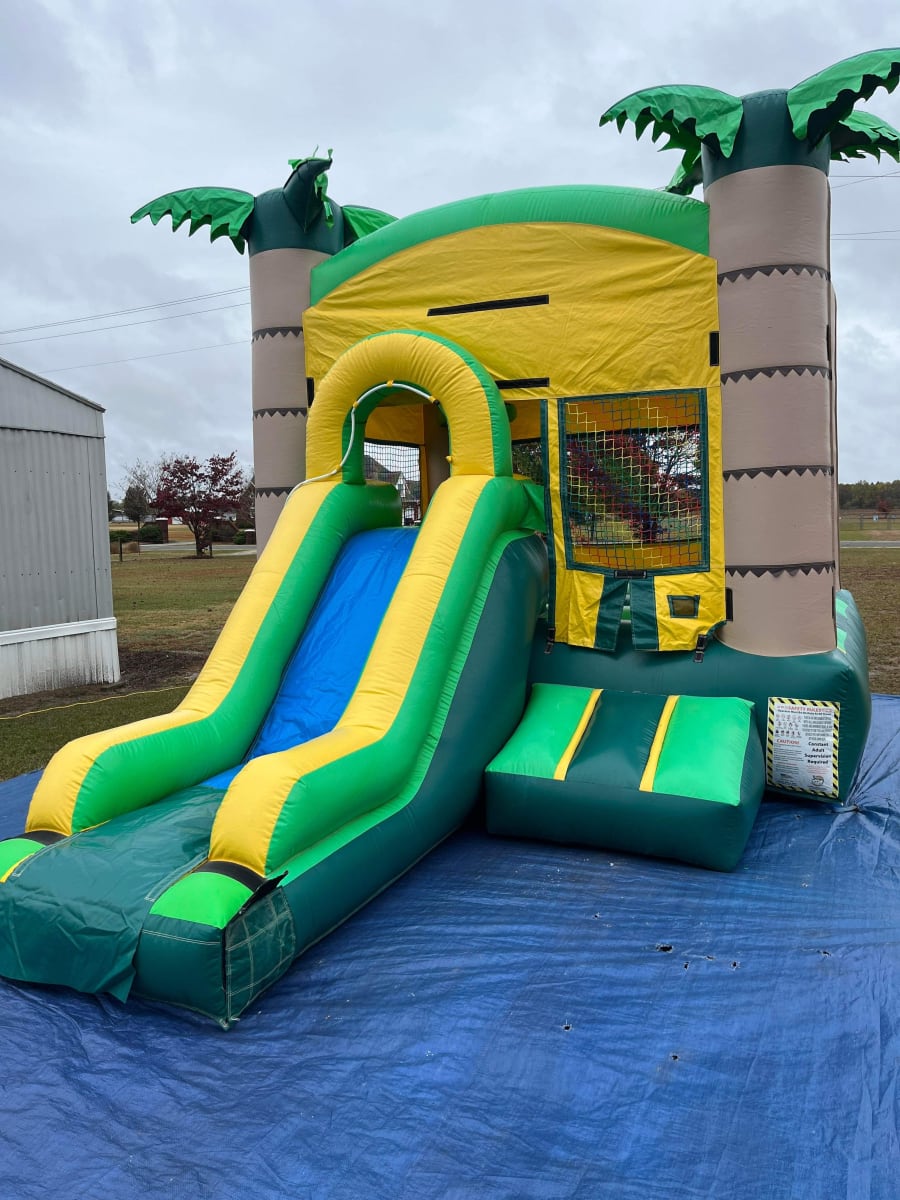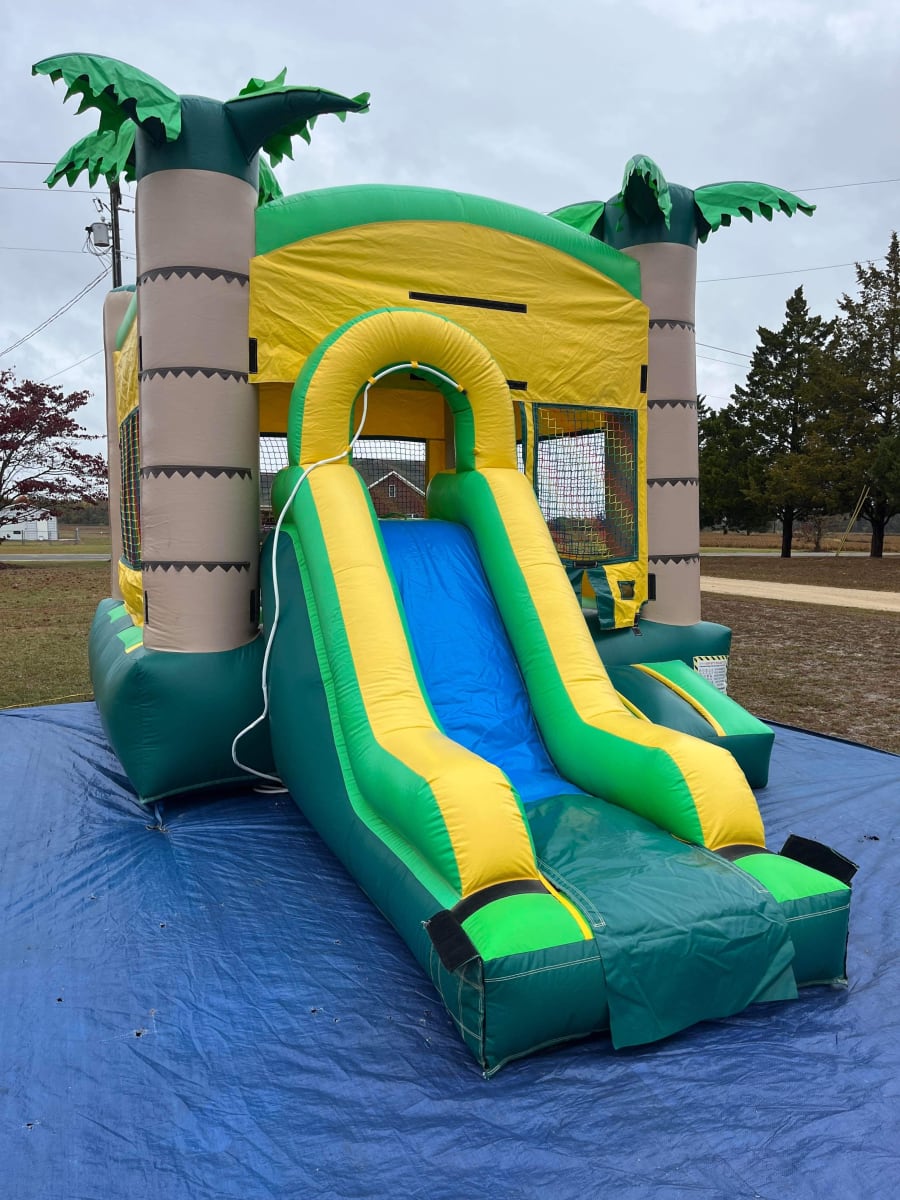 This Palm Tree Mini Combo is perfect for any season. It includes a basketball hoop inside the bounce house and a slide at the end .It is super fun for your guest and great for any party especially a tropical theme party .One feature this slide includes is a water hose attached at the top that sprinkles down the slide to make it slippery fast.