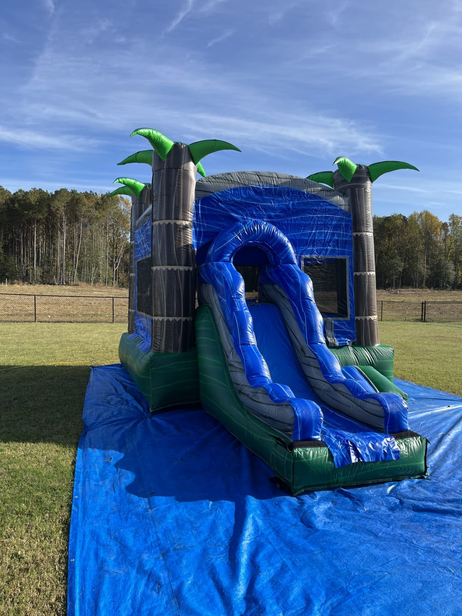 This Palm Tree Mini Combo is perfect for any season. It includes a basketball hoop inside the bounce house and a slide at the end .It is super fun for your guest and great for any party especially a tropical theme party .One feature this slide includes is a water hose attached at the top that sprinkles down the slide to make it slippery fast.