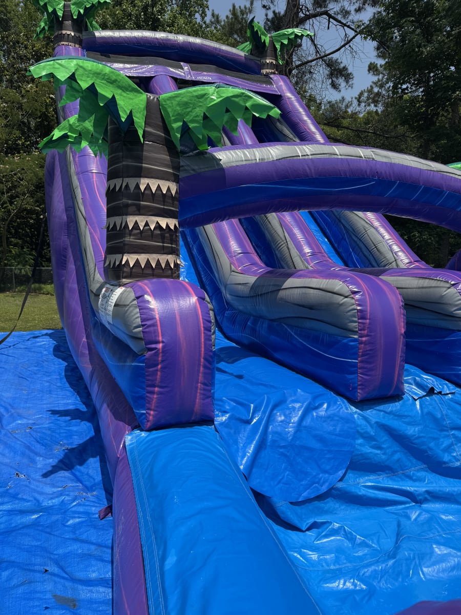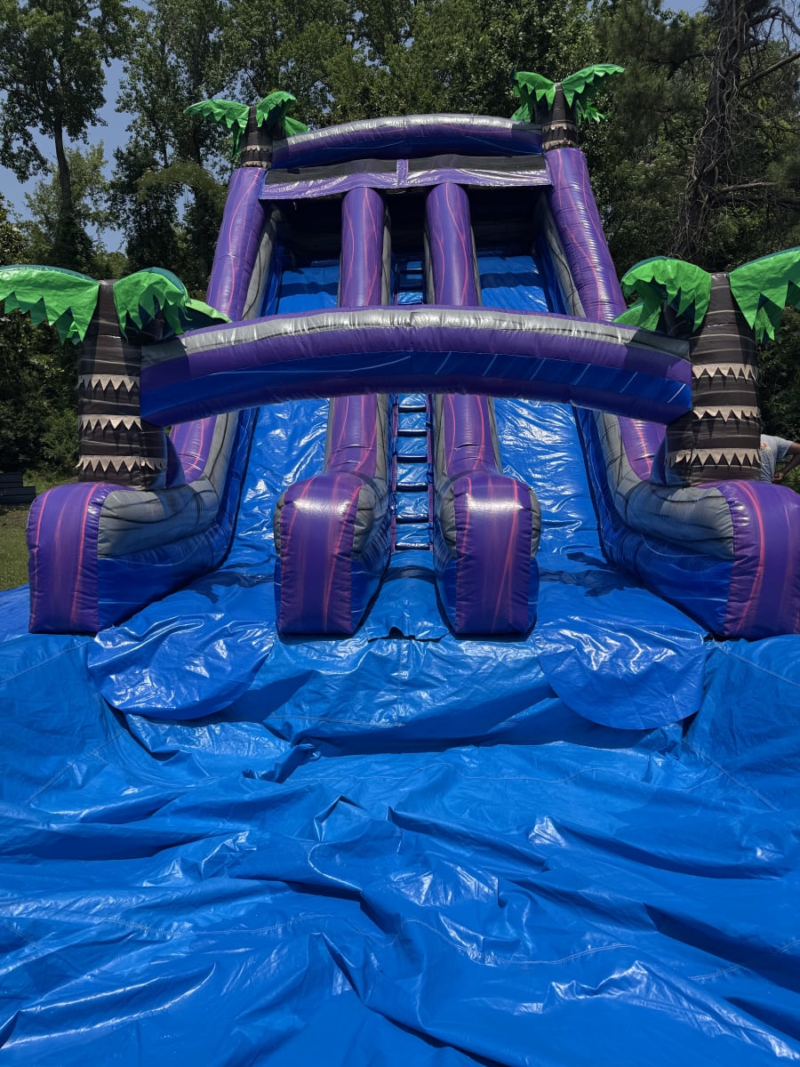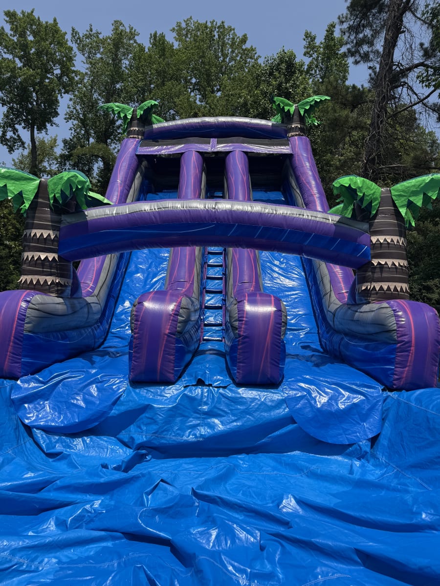 This is the 20 ft. purple water sldie. This unique 20 foot waterslide is sure to wow all your guests. This purple and blue marble make this water slide look amazing. Climb to the top of the platform and slide down the 20 foot slide for a thrilling water slide experience. Be sure to book This water slide early. (ENTRANCE TO SETUP AREA MUST BE AT LEAST 4 FEET WIDE)