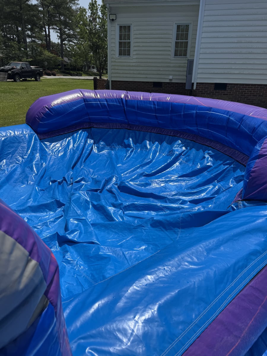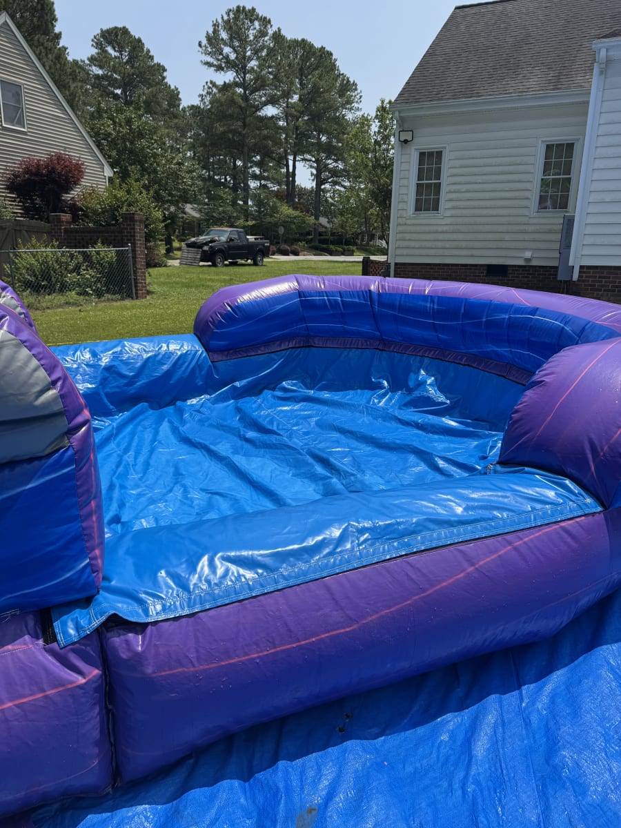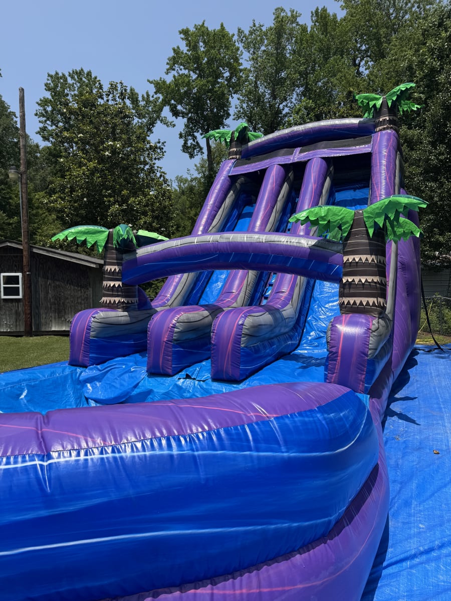 This is the 20 ft. purple water sldie. This unique 20 foot waterslide is sure to wow all your guests. This purple and blue marble make this water slide look amazing. Climb to the top of the platform and slide down the 20 foot slide for a thrilling water slide experience. Be sure to book This water slide early. (ENTRANCE TO SETUP AREA MUST BE AT LEAST 4 FEET WIDE)