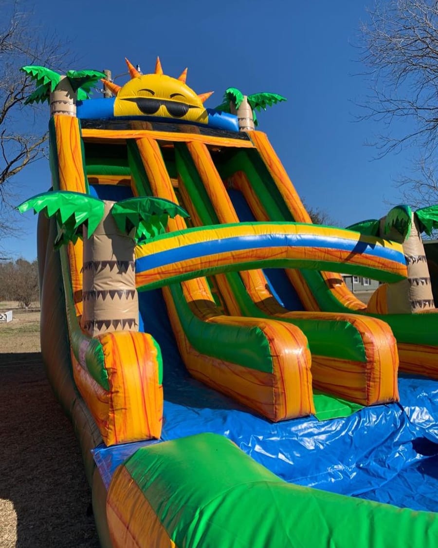 This is the 20 ft. fire water sldie. This unique 20 foot waterslide is sure to wow all your guests. The orange and red marble make this water slide look hot. Climb to the top of the platform and slide down the 20 foot slide for a thrilling water slide experience. Be sure to book This water slide early. (ENTRANCE TO SETUP AREA MUST BE AT LEAST 4 FEET WIDE)